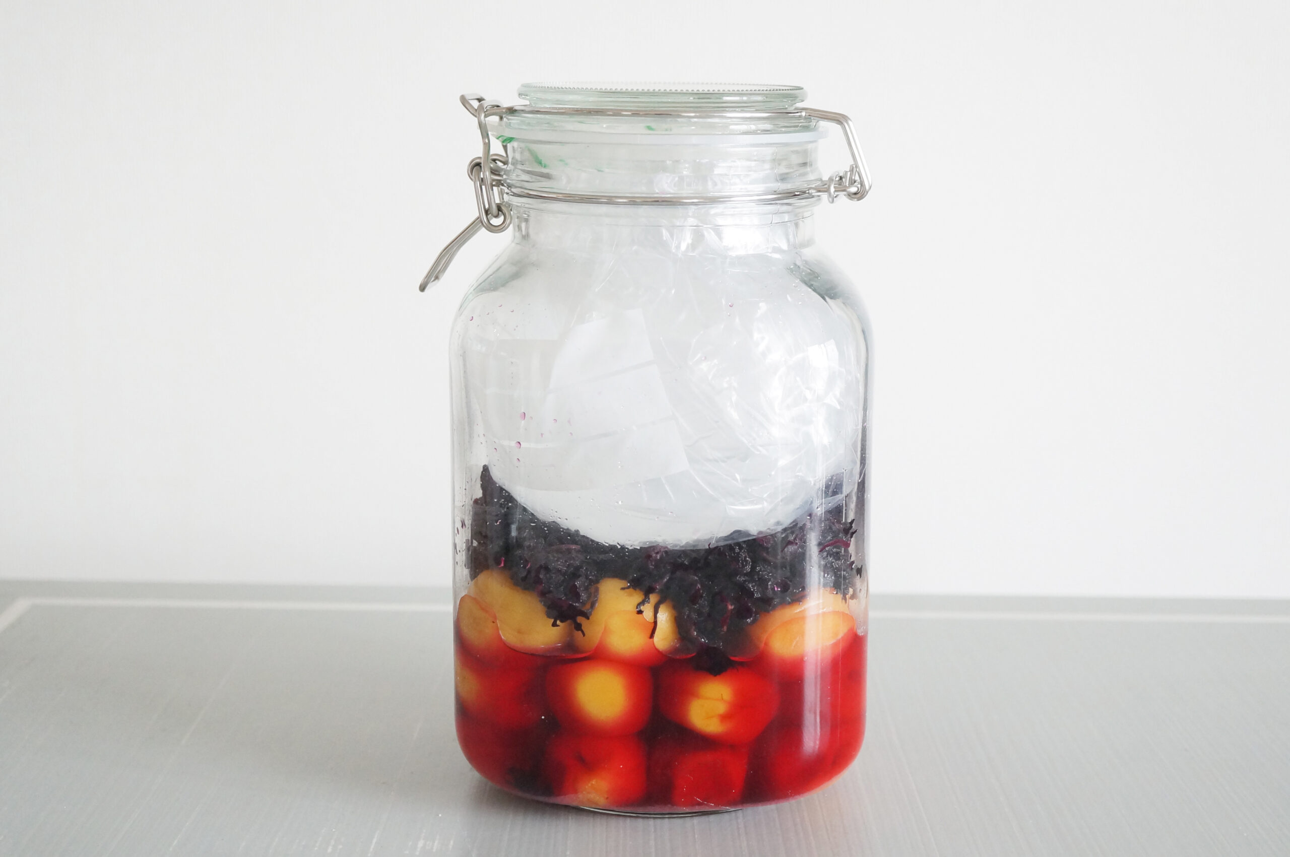 プラスチック容器では赤い色素が移ることがあります。赤梅酢はガラス瓶に入れると見た目もきれいに保て、風味も損ないません。