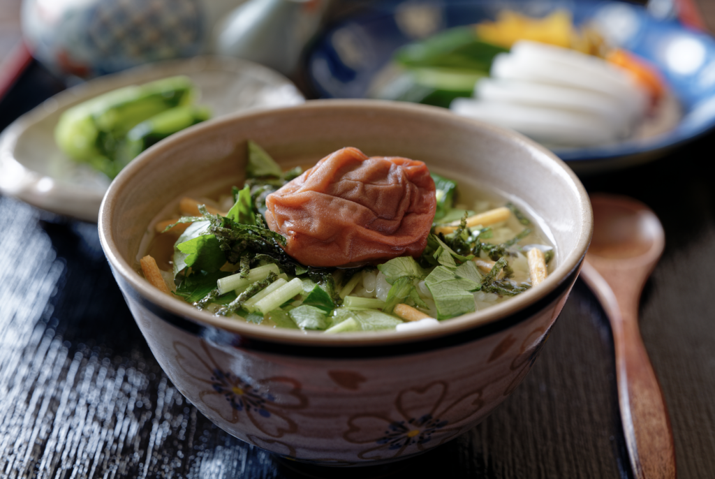梅干しの酸味と削り節のうまみが絶妙に結びつき、食欲を刺激します。また、梅干しに含まれるクエン酸が胃酸を中和し、胸焼けの不快な症状を緩和します。