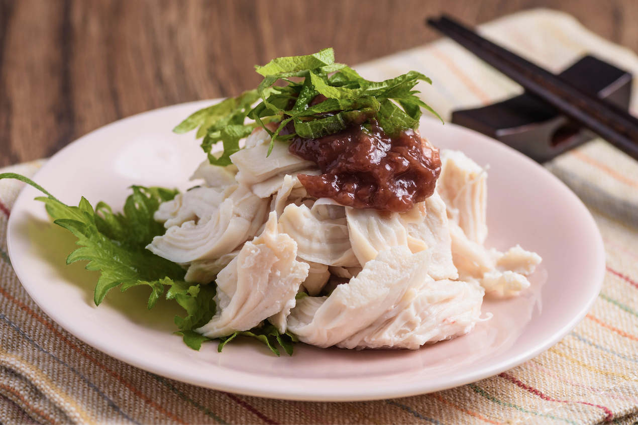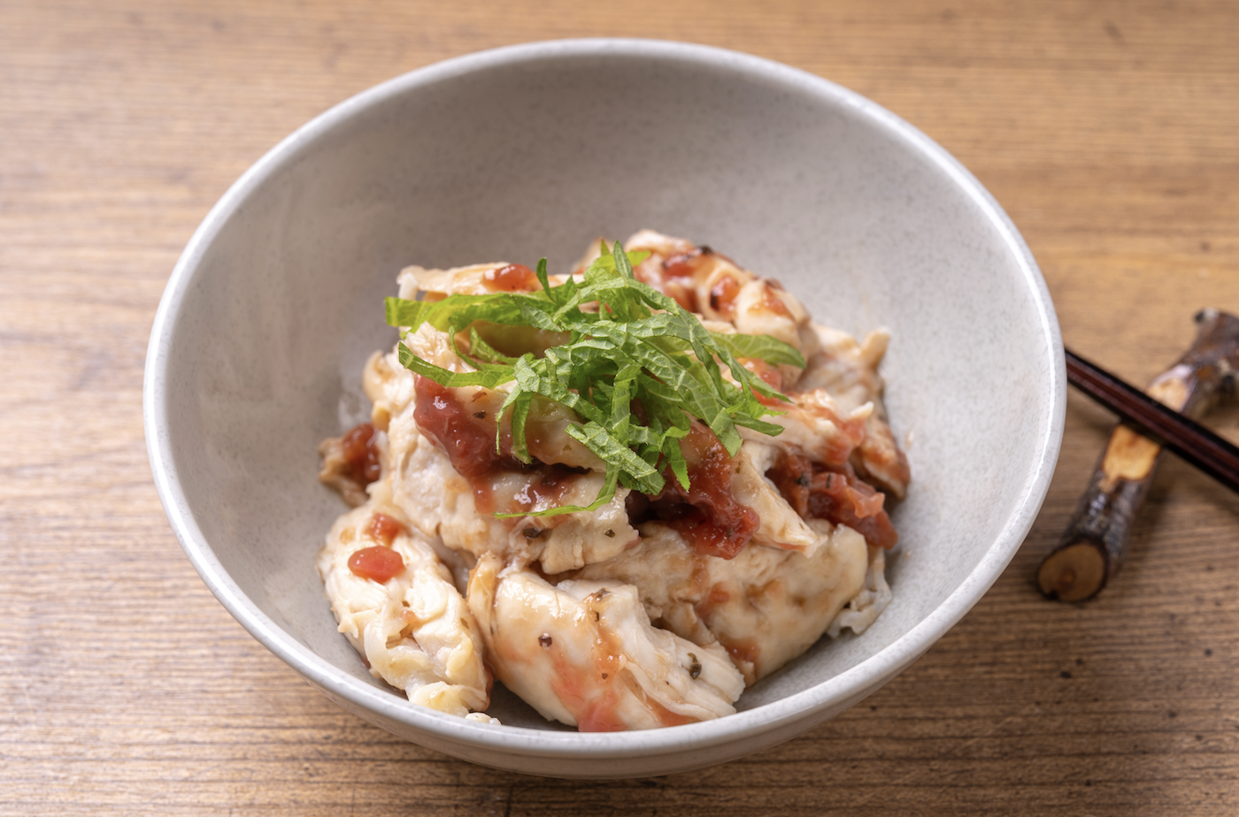 蒸しあがった鶏肉を皿に盛り、梅肉ソースをたっぷりかける。お好みで刻んだ青じそや白ごまをトッピングして完成。