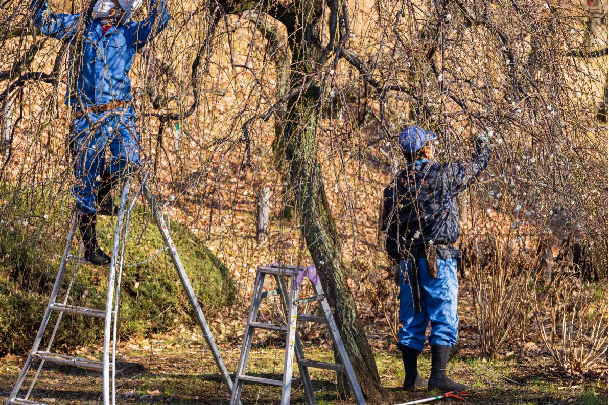 葉が落ちて樹形が見えやすくなる冬は、樹形を整えるのに最適な時期です。古枝や弱った枝、樹形を乱す枝を剪除し、翌春の花芽を確保します。冬剪定は休眠期剪定とも呼ばれ、木に負担をかけずに形を整えられる時期です。
