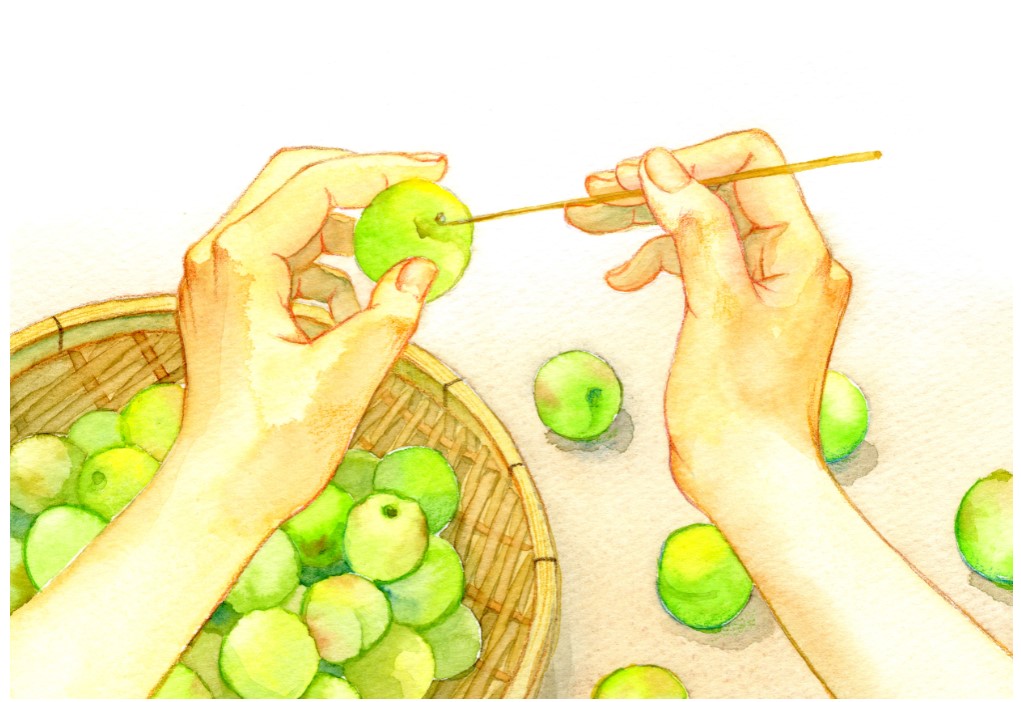 - 下準備として、青梅を水洗いし、アク抜きと軸取りを行ってください。